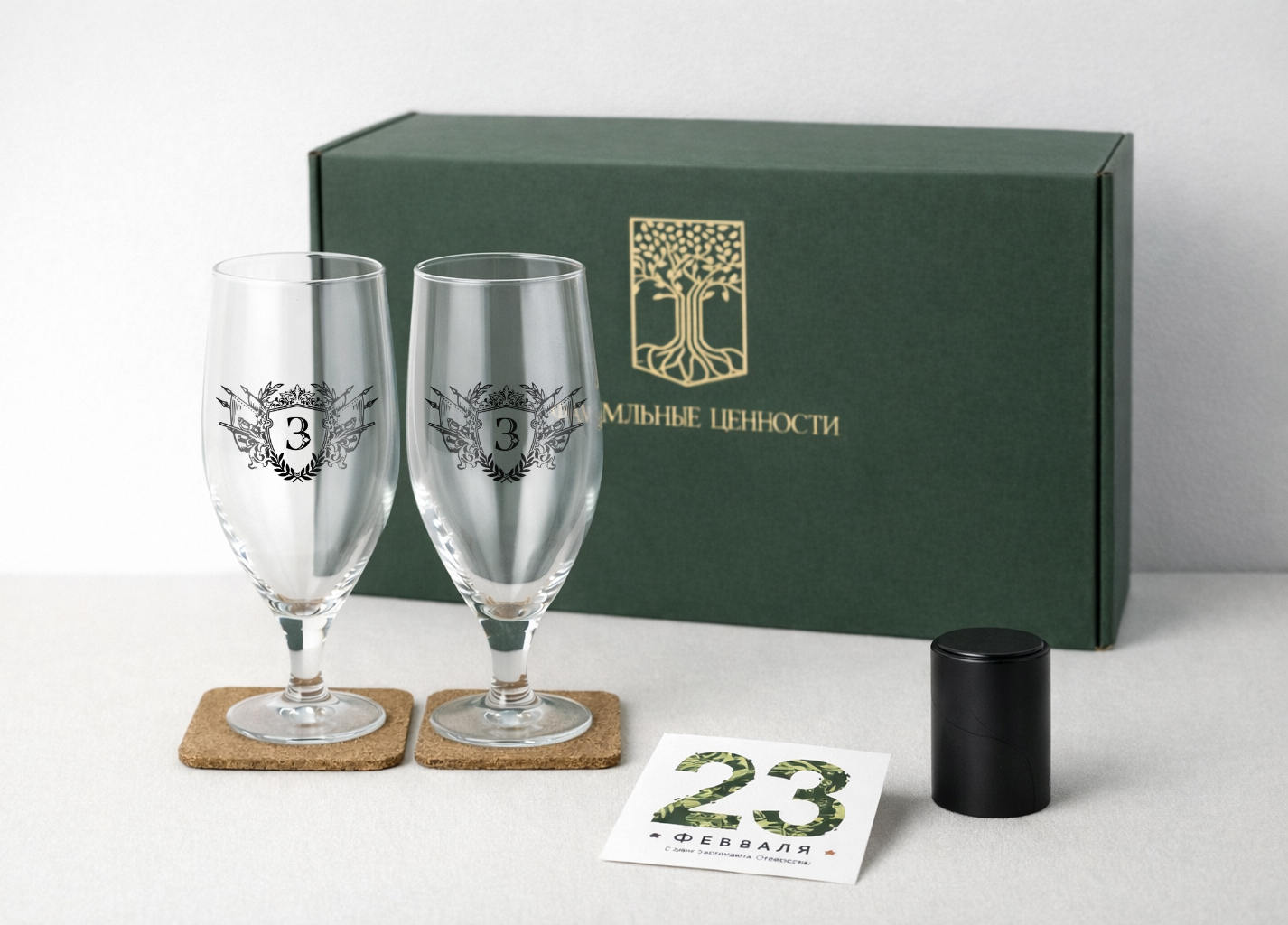 Набор пивной: 2 бокала для пива с гербом/монограммой/логотипом, 2 пробковые подставки, удобная магнитная открывашка, открытка к 23 февраля.